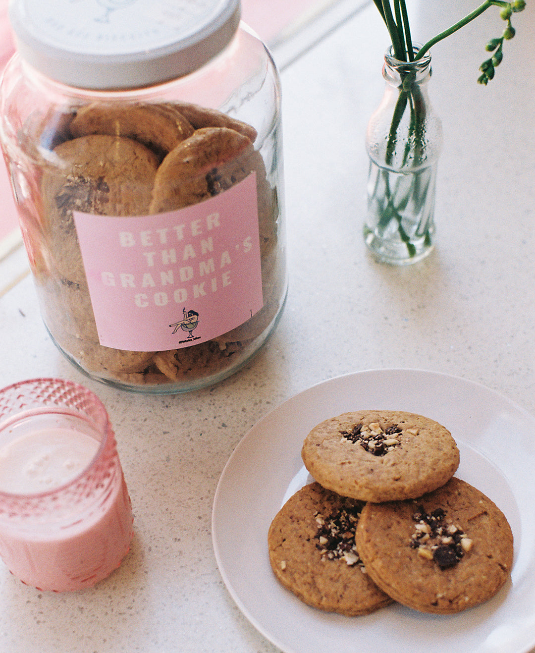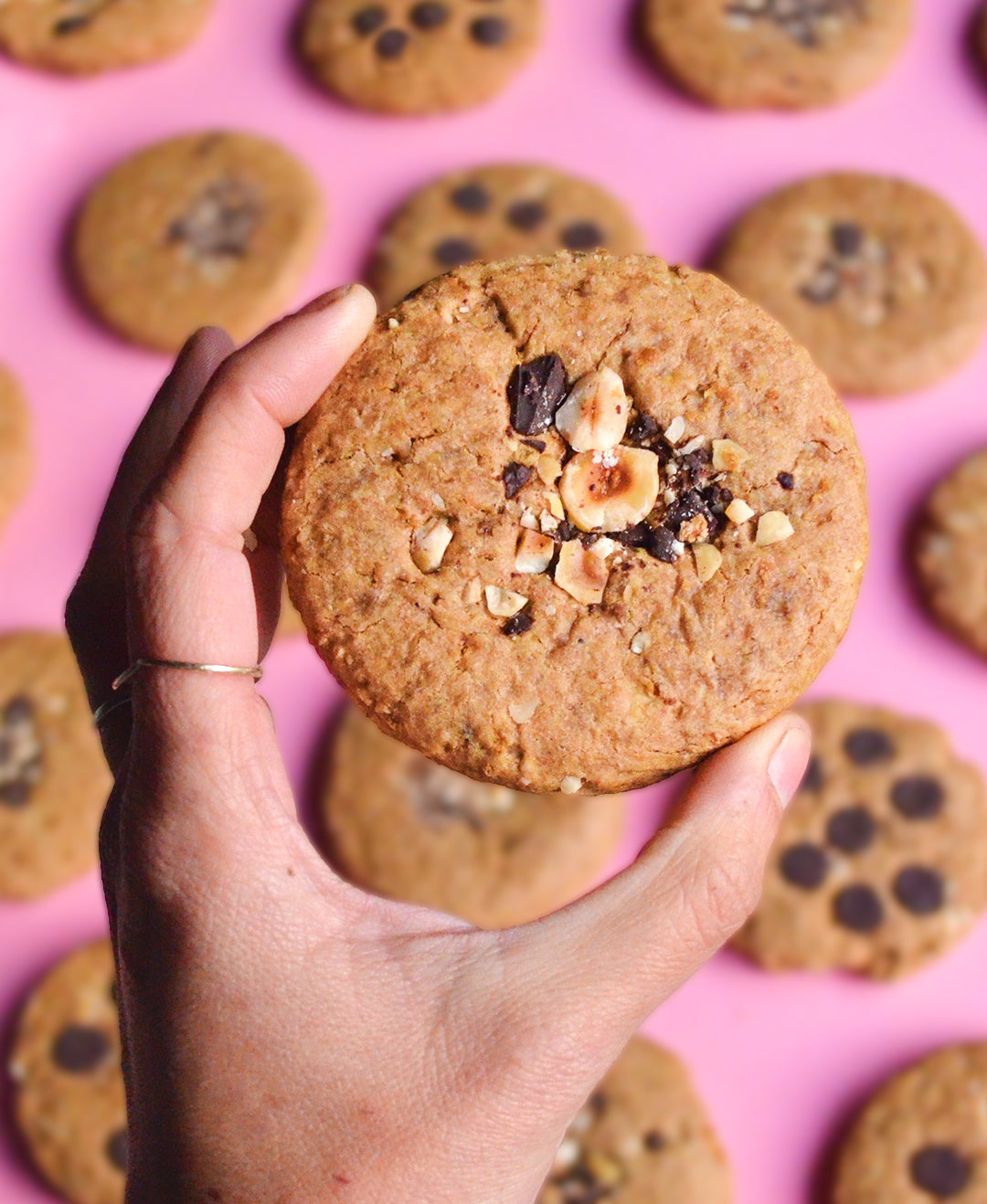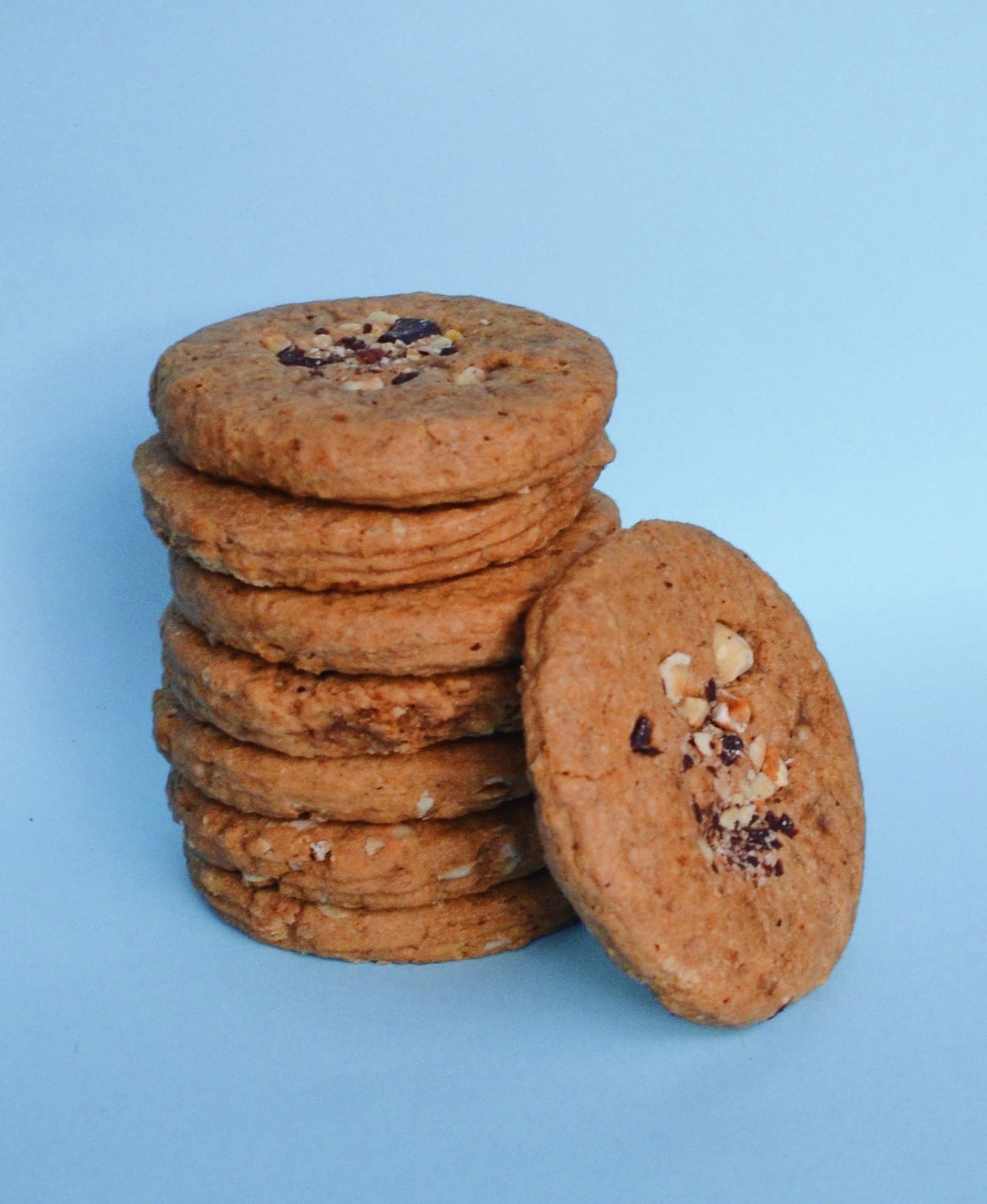 hazelnuts, gluten free flour, coconut sugar, sea salt, choc chips and a secret family recipe.